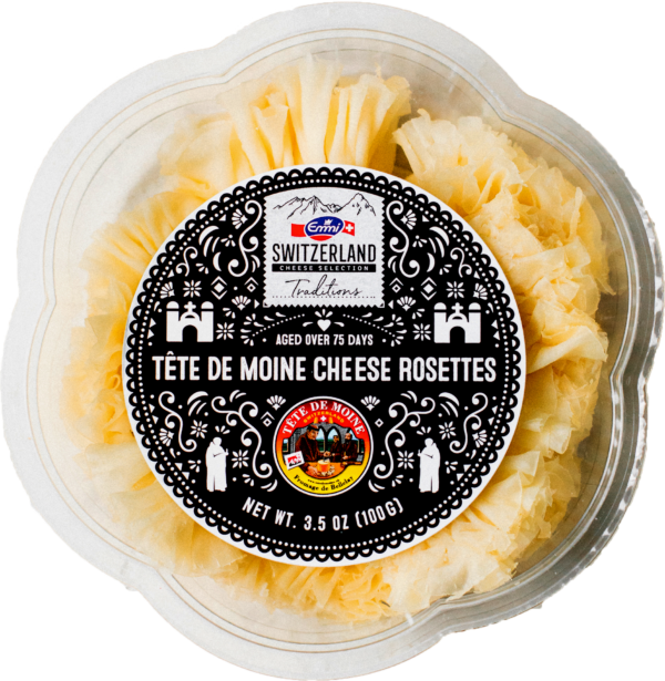 Beautifully presented in a flower-shaped container, the Tete de Moine is scraped into fine rosettes using a girolle cheese curler. This technique increases the surface area and exposure to air, changing the structure of the cheese and allowing the aromatic, gently nutty flavor to bloom and develop to its fullest.